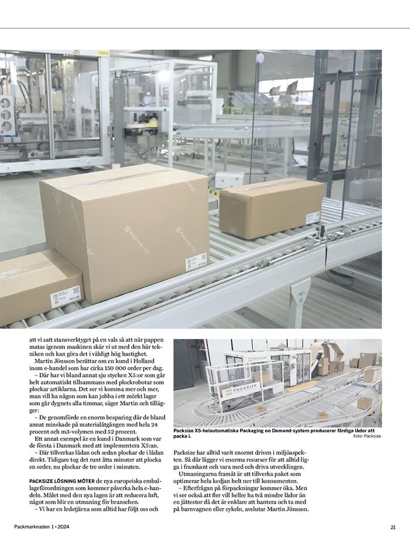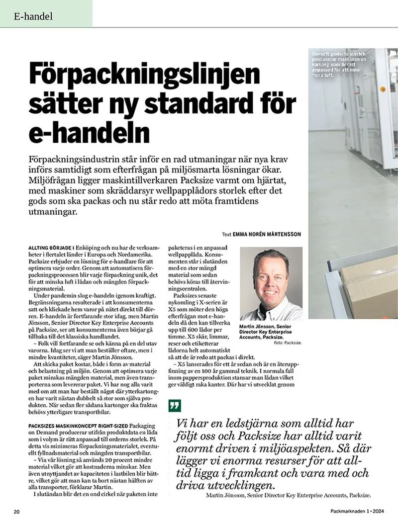 PACK Marknaden är en av de viktigaste förpackningspublikationerna på den svenska marknaden. Martin Jönsson intervjuades nyligen i tidningen och berättade om Packsize historia och aktuella tekniktrender, såsom automation och processoptimering. En stjärna i samtalet var vår senaste innovation, "Erected Box System" X5. Och faktum är att Packmarknaden rubricerade artikeln som "Automatiserad förpackningslinje sätter ny standarder för e-handel".